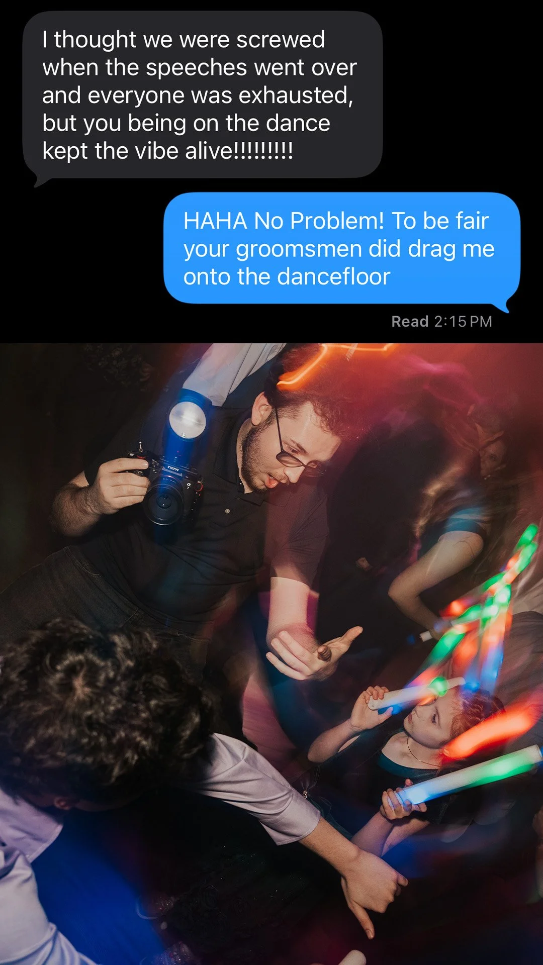 I don't hide in the bushes or act like a "vendor." I get the best shots by being part of the party. When I’m on the dance floor with you, people drop their guard and that’s when the real, unscripted magic happens.